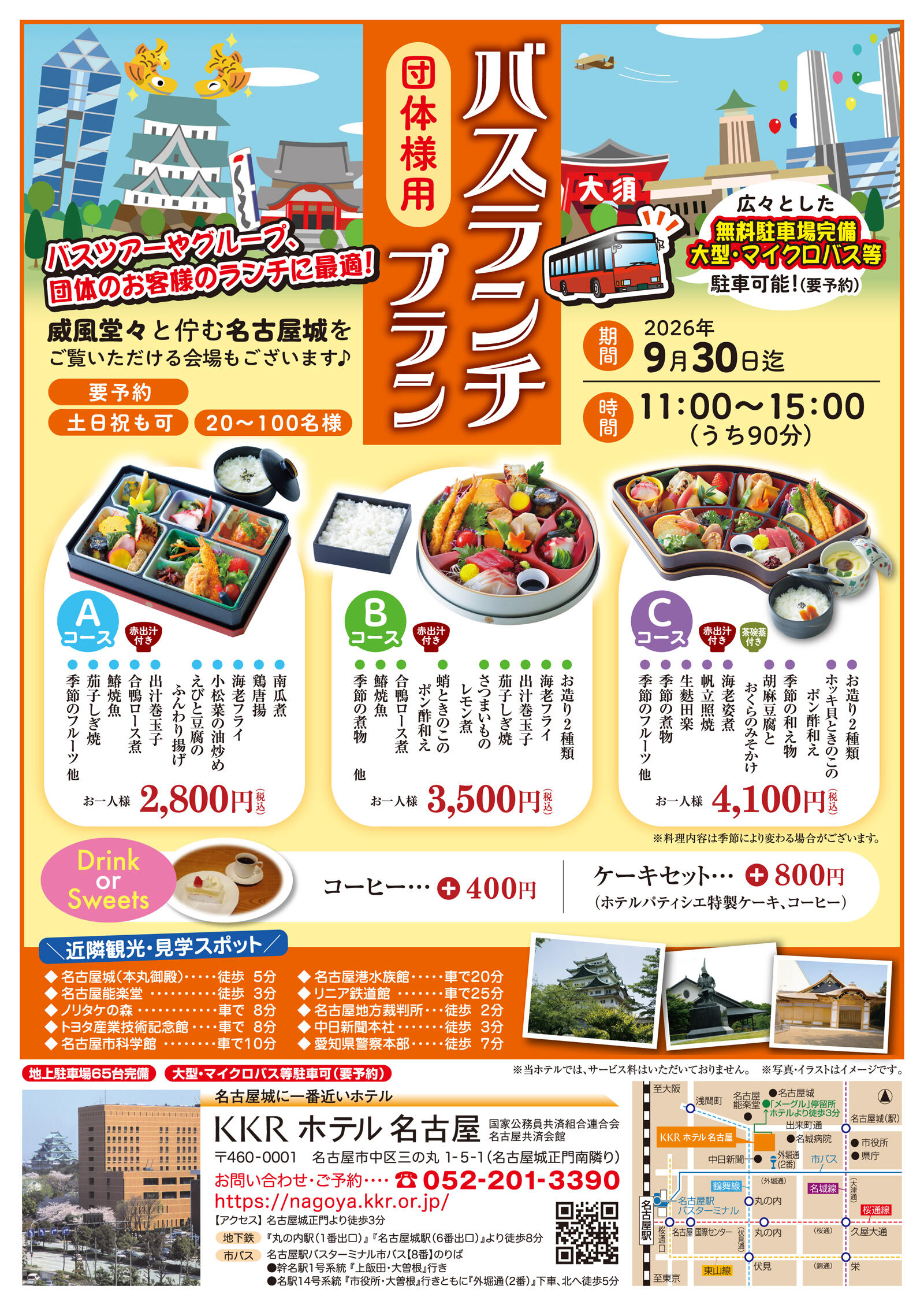 | 料金 | Aコース・・・お一人様 2,800円(税込) Bコース・・・お一人様 3,500円(税込) Cコース・・・お一人様 4,100円(税込) コーヒー・・・+400円 ケーキセット・・・+800円 (ホテルパティシエ特製ケーキ・コーヒー) |